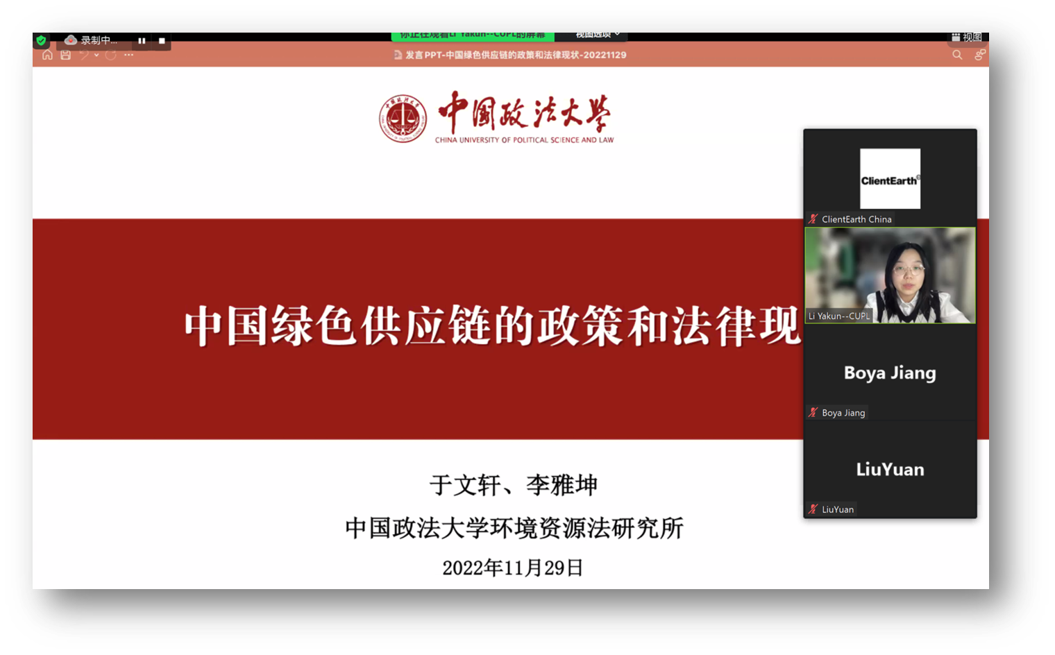 黑料网 环境与资源保护法学专业硕士生李雅坤参加“全球绿色价值链多方交流研讨会”并作主旨发言