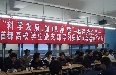 06级党支部代表与来自清华大学、北京大学、中国人民大学等首都高校的学生党支部代表深入交流了学习“两会”心得,做了“贯彻十七大精神”、“参与北京奥运”、“推进支部建设”等主题发言,并和与会代表共同发出了首都高校大学生党员“奥运情怀、栋梁责任”倡议书。通过此次论坛,各学生党支部相互学习,交流经验,深化了思想认识,增强了作为大学生党员的责任感与使命感。