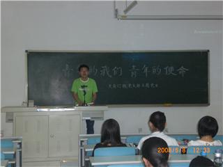 2007级党支部全体成员以温总理五四青年节来法大看望同学为契机,开展了“青年的我们·青年的使命”主题党日活动。活动通过调研当代大学生的爱国史观,观看温总理法大之行视频,学习当代爱国大学生先进事迹等丰富多彩的形式,促使全体学生党员认真体悟了国家领导人对当代青年大学生的深切关怀和殷切期望,深刻思考了作为当代大学生应该肩负的使命与责任。