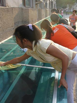 任务分配完毕之后,党支部的同学进入各自的区域,迅速开始行动。分工明确,组织合理。清理垃圾,擦拭建筑物,倒换脏水,有条不紊的进行着。初秋的清晨虽已微凉,但2005级党支部的不少同学已经开始冒汗。尤其是负责清理地下室之上的雨蓬的同学,因为雨蓬较宽且积尘过久,擦拭完之后,手臂的酸痛不言而喻。中午2006级党支部党员顶着炎热,清理着礼堂周围的垃圾。整个活动中,没有人有怨言,大家都认真的劳动着,默默的以自己的方式,表达着对老师的感激之情。2005级同学的一位这样说:“我的父母都是老师,我能真切的体会到一个老师对他的职业的付出,也更能理解他们的艰辛。希望通过这个活动,可以给老师一个整洁的办公环境,祝他们教师节快乐。”2006级的同学说:“每天上课,看老师那么辛苦,特别想为他们做些什么。希望这次活动能传达我对老师们的祝福。”此外,很多同学都表示,想用这次活动,对老师说一句:老师,您辛苦了!