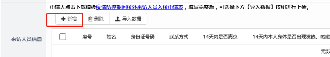 如上图点击新增,在弹出对话框中填写相关数据,若入校人员较多,也可通过下载模板、导入数据方式进行上传相关信息。如有入校车辆车牌号填在“其他需说明问题”中。
