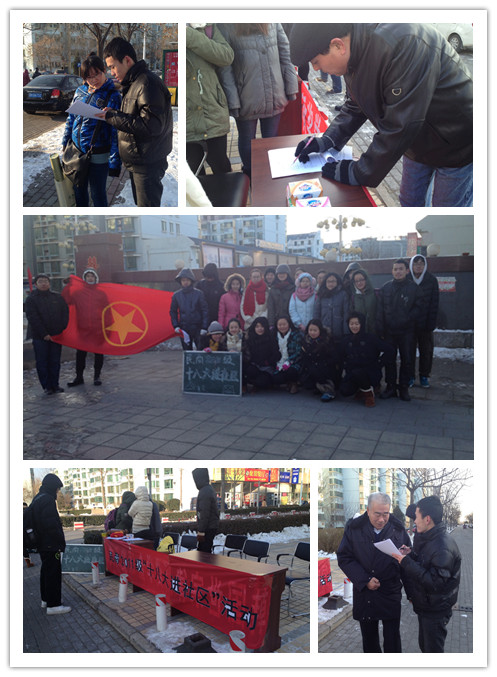 当日上午八时许,迎着凛冽的寒风,各班参与同学早早集合在校园南门。各班签到之后,在团总支同学的带领下,队伍浩浩荡荡地出发了。到达宁馨小区后,在居委会管理人员的带领下,团日活动迅速开展起来。为了保证活动的效率,活动采取分小组进行,通过将人员分为展台小组、传单小组、问卷小组,大家各司其职,各尽其能。展台前的同学们热心为前来咨询了解的市民悉心讲解党的十八大精神的具体内容,传单组在小区周边顶着凛冽的寒风派发传单,问卷小组积极向感兴趣的社区住户通过有奖问卷的形式了解情况,并送上我们准备的一份小礼物。