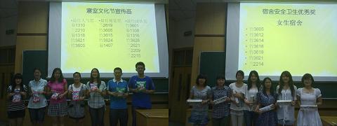 此次年级大会首先展示了团总支工作总结的视频,生动地介绍了一学期来民商09级开展的各项丰富多彩的年级活动。接下来团总支书记何吉如同学发言,总结了大二下学期的年级工作,涉及生活、学习、文体等多方面,带领全体同学一起回顾了一学期的工作和活动,同学们在聆听中感慨时光的飞逝和期末临近的紧迫感。其后,便是班级的成果风采展示环节。各班都展示了最具班级特色、最体现班级凝聚力的风貌。同学们在观看的同时,也感受到了班级的温暖、老师的尽职以及同学间的友谊。班级风采展示之后,激动人心的颁奖环节如期进行,奖项有:市级“先锋杯”团支部、校级和院级团支部、五四评优个人、年级活动中获奖班级和宿舍等等,辅导员蒋老师给每个获奖班级、宿舍和个人颁发荣誉证书和奖品。每份证书和奖品貌都是各班同学尽心尽力,齐心协力换来的荣耀。
