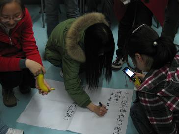 同伴教育志愿活动的另一重要主旨即宣讲关于艾滋病的知识。在性基本知识的普及后,这一板块显得更为严肃和沉重。在教室地板铺开的两张大白纸上是四个关于艾滋病的问题,同学们围着这几个问题,或跪着写下自己的答案,或站着给写字的人提供信息,或弯着腰仔细地看着,思忖着。随后,主持人并不急于公布正确答案,却问了我班同学每一个人关于艾滋的第一直觉。此时,我班同学褪去刚才游戏时的笑容,都认真地给自己的答案:性,可怜,死亡,吸毒……主持人在明确大家的感性认识之后,开始细致地逐一向大家宣讲艾滋病的知识:艾滋病的全称、艾滋病的致病机理及病程、机会性感染、现今世界和中国各地的艾滋病的现状、HIV的三大传播途径和传播条件……
