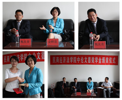 昌平校区隆重举行,中伦文德律师事务所高级合伙人金鲜花律师、甄庆贵律师、闵敏律师, 2010年中伦文德奖学金评定小组教师代表姚国强老师和获奖同学及其他学生代表参加了颁奖仪式,仪式由学院分团委副书记董宁博主持。