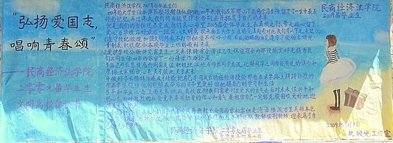 2009年“弘扬爱国志 唱响青春颂”毕业生文明离校工作已经拉开帷幕,这一次以毕业生离校将以切合时代大背景的“责任与信心”为主题,开展一系列以健康文明为宗旨的活动。
