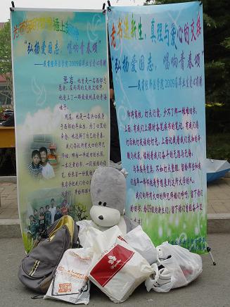 毕业生爱心捐赠活动在2009年6月7日至6月10日中热烈进行,2009届的毕业生们纷纷将自己的书本、衣物甚至心爱的毛绒玩具、纪念徽章都捐赠了出来。同时还有很多同学驻足在海报前抑或走上前询问工作人员捐赠的具体时间和事项,这些细微的举动都体现着他们内心渴望奉献的精神。