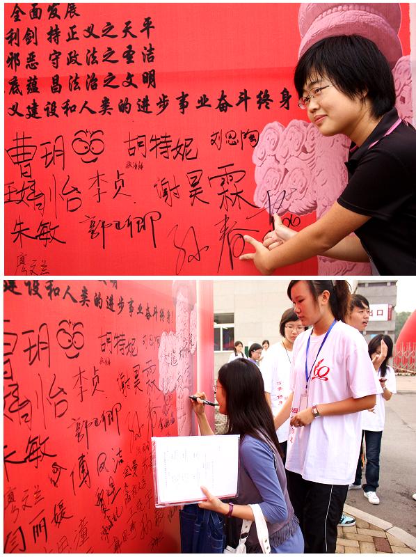 的第一刻就签下他们的承诺和誓言,“当我步入神圣政法学府之际,谨庄严宣誓:……”,学生们签字时认真的眼神和庄严的神情无不透露着他们对于未来从事的法学学习和法律职业的渴望和追随。