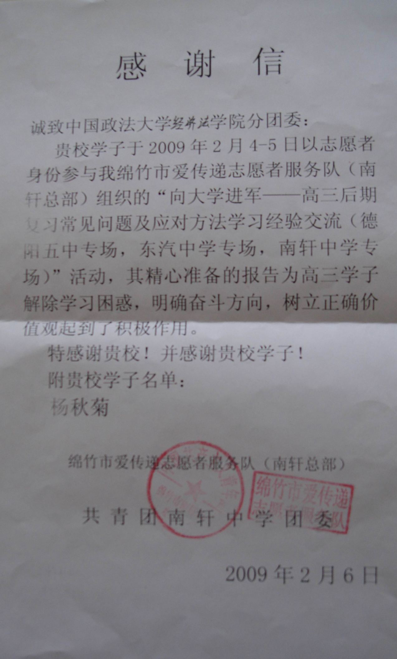 分团委收到了一封来自四川省地震重灾区绵竹市南轩中学团委的感谢信,信中对民商院2008级法学实验班学生杨秋菊在寒假期间参加绵竹市爱传递志愿者服务队组织的“向大学进军——高三后期复习常见问题及应对方法学习经验交流”活动给予了高度的赞扬。学院向杨秋菊同学本人了解情况以后,才知道事情的原委。