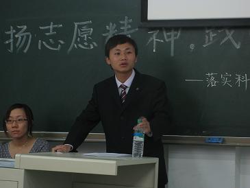 4月15日18:30,法学实验班“学习实践科学发展观,践行弘扬志愿者精神”主题团日活动的讲座部分在端升楼308举行,学校深入学习落实科学发展观学生宣讲团第二小组成员出席会议,并就“践行发扬志愿服务精神”的主题为法学实验班同学带来精彩的演讲。宣讲团成员在为实验班同学讲解了科学发展观的定义与内涵,并在此基础上,结合青年学生开展志愿服务的现状,为实验班同学即将进行的的志愿活动进行指导。演讲的最后,宣讲团成员以“努力践行志愿者精神”鼓励每位在场的实验班同学积极践行服务社会的理念。