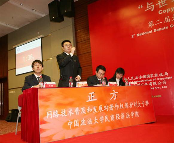 辩论队和西方交通大学辩论队之间展开角逐,国家新闻出版总署、中宣部、国家版权局、中国版权协会等机构的二十多名领导莅临了决赛现场,辩论赛由中国版权协会理事长沈仁干、国家版权局版权管理司司长王自强等担任了本次比赛的评委。