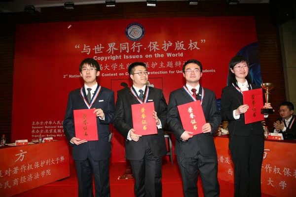 凭借更为全面的视野和精彩的发挥,捧得本届大学生版权保护主题辩论赛的冠军奖杯;西安交通大学虽屈居亚军但也不失辩者风范。同时参加本次大赛的其他院校分别获得了其他奖项:北京印刷学院荣获协作奖,中南财经政法大学荣获组织奖。