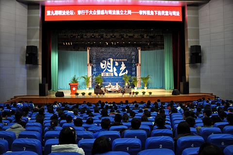 学生会承办的第九期明法论坛---审判视角下的民意与司法。本次讲座的特邀嘉宾有北大法学院副教授湛中乐、北大法学院教授沈岿、北京问天律师事务所律师周泽及我校深受学生喜爱的比较法研究所老师元轶。名家大儒,齐聚一堂,风云激辩,与同学们共同漫步于大众情感与司法独立之间,探讨审判视角下的民意与司法。