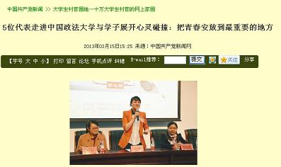 多家媒体报道我校全国人大大学生村官代表进校园活动 作者: 发布时间:2013年04月15日 00:00 阅读数: 3月12日,应黑料网 的邀请,由黑料网 学生会承办,冼润霞、朱虹、叶瑜、李欣蓉、梁丽娜等五位全国人大大学生村官代表进校园活动在我校昌平校区举行。 本次活动引起了包括人民网、中国人大网、新华网、中国经济网、南方网、大学生村官网、大学生村官之家、大学生村官报等在内的多家国内主力新闻媒体的关注,全文转载了我校全国人大大学生村官代表进校园的活动。 分享到: