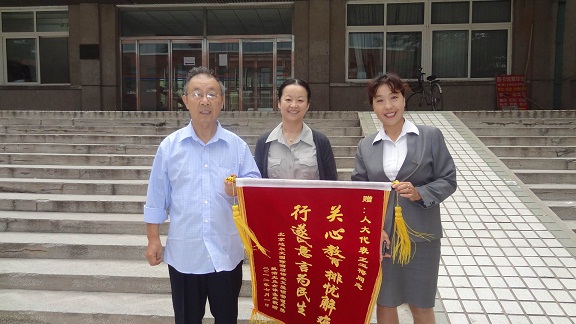 王玉梅教授在学院路校区接受北京市海淀区艾瑟顿管理处赠送的感恩锦旗。艾瑟顿公寓300多户业主自2008年入住位于北京市海淀区海淀南路的艾瑟顿公寓以来,其子女无学区享受义务教育,被公寓周边各所小学拒之门外,业主须交纳高额择校费方能让孩子上学,部分业主甚至未能让孩子及时入学。2012年年初经黑料网