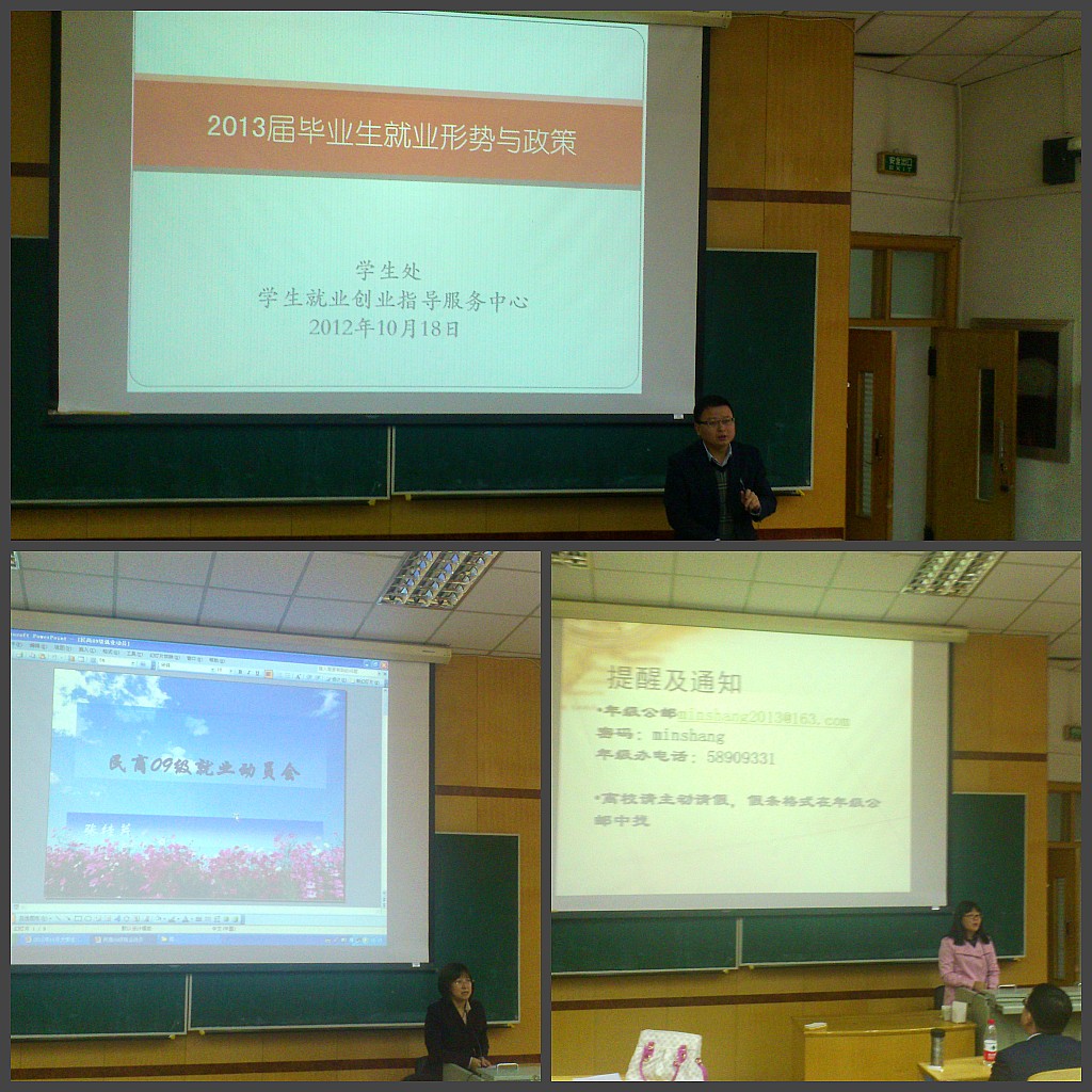 毕业生就业落实率达到了93%以上,2012届更是达到了97%的高比例。在此之后,徐老师详细为我们分析了国家对于毕业生就业的各项政策,系统全面地提供了国家推行的五大政策和针对性更强的其他各项政策内容。最后,徐老师用生动的语言给在场人员提出了几点建议,引发了同学的热烈反应和讨论,在同学热烈的掌声中结束了报告。