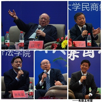 最后一轮的讨论之前,李永军向嘉宾提议选择以最擅长的方面阐述“在未来民法典中关于法人和人格权等具体内容应如何改进”的问题。江平指出不应该把“财产法人”和“社团法人”的概念照搬到民法典中,他认为两者区别的界限应该引入到民法典中。尹田基于民法调整对象指出,人格权应该由宪法规定。王卫国则认为人格权可以整合到人法,但不可以搞法定主义,同时他指出法人中的“自然集合体”应放到“自然人”里。孙宪忠指出民法立法技术值得探讨。提问环节。同学们抓住与心目中的法学大师交流的机会,踊跃提问,教授们的精彩回答不时引起全场的阵阵掌声。