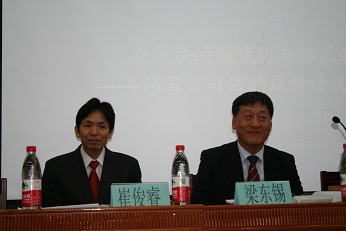 商法研究所主办。我校韩国法研究中心主任吴日焕老师担任本次论坛的主持人,韩国法研究中心秘书长陈景善老师担任本次论坛的翻译。本次论坛邀请了韩国高丽大学法学院郑灿亨教授,韩国成均馆大学法学院崔埈璿教授,韩国朝鲜大学法学院梁东锡教授,清华大学法学院王保树教授,清华大学法学院朱慈蕴教授,我校赵旭东教授,王涌教授和我校商法研究所的众多老师。
