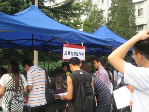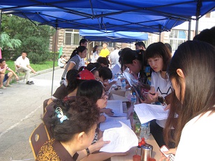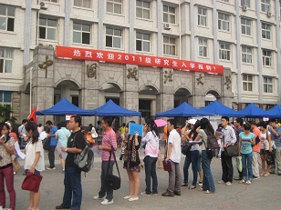 2011级研究生新生在学院路入学报到。为了更好地迎接并服务新生,学院进行了紧张而充分的准备。考虑到部分新生会提前到校,为了应付新生报到的高峰期,29日早7点,学院相关负责老师、2010级各班志愿者和团总支委员们到达学校指定的迎新区域,对迎新工作站进行了布置,提前展开迎新工作。面对远道而来的新生,工作人员各就各位,或是有序引导新生完成报名手续,或是耐心解答新生及家长提出的问题,或是热情帮助新生解决报名过程中遇到的问题。在学院老师的指导和团总支委员的协调下,广大工作人员克服时间紧、任务重、天气闷热等条件,坚持奋战,配合无间,收获了很好的效果,得到了新生和家长们的一致赞扬,整个迎新过程井井有条,没有出现任何的大差错。