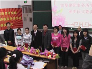 分党委副书记兼副院长王洪松和雷曼律师事务所的李建刚律师为其中的七名同学颁发了荣誉证书,王卫国院长和Edward E. Lehman先生则为获得前三名的同学亲自颁奖,随后,获奖同学代表发言。她表示,获得奖学金既是对以往成绩的肯定,更是对今后学习、工作的激励和鞭策,她会把这种荣誉转化为动力,不断克服困难,取得更大的成绩,不辜负祖国、学校和社会的培养与殷切希望。
