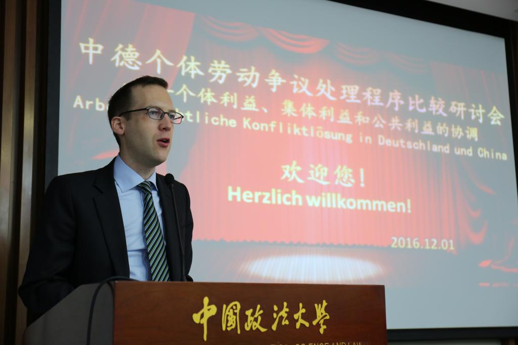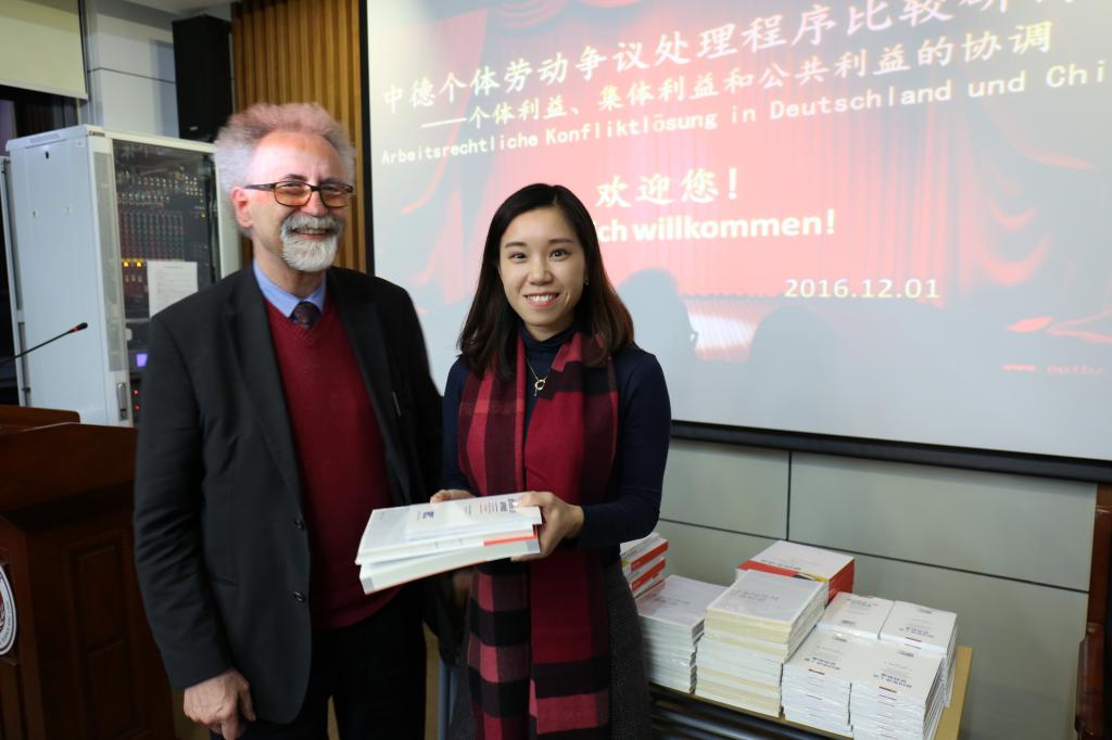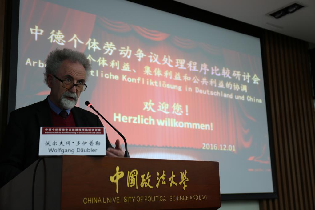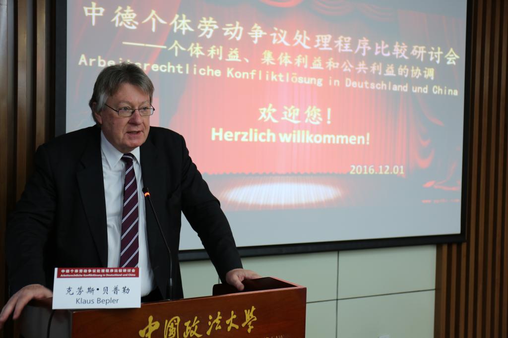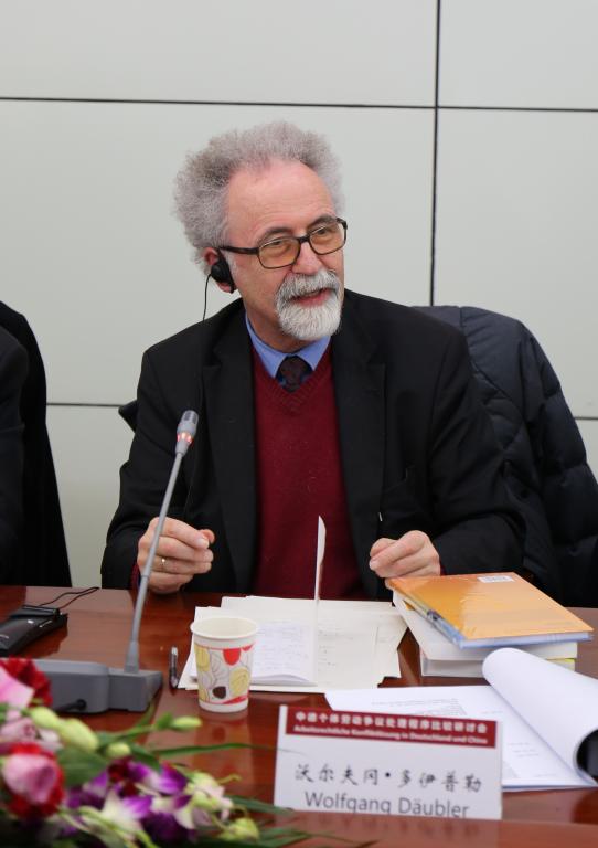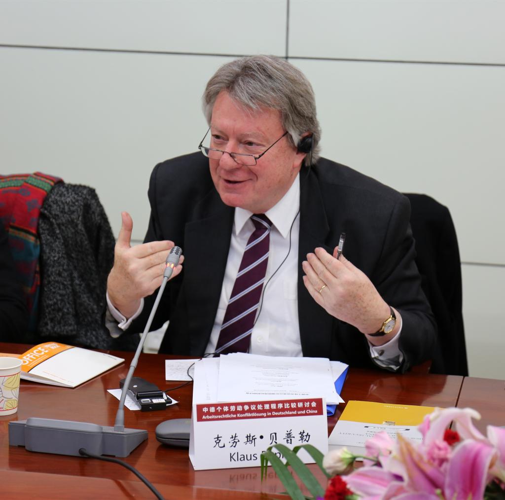 来自德国和中国的40余名学者和实务界专家出席了研讨会。德方参会者主要包括:德国不莱梅大学法学院教授沃尔夫冈•多伊普勒,德国联邦劳动法院前院长即前首席大法官克劳斯•贝普勒,德国弗里德里希•艾伯特基金会驻中国代表克利斯朵夫·帕尔曼、项目主管习若蜜等,弗里德里希•艾伯特基金会聘请的同声传译译员北京外国语大学德语系主任、教授王建斌和外交部德语高级译员肖君。中方学术界黑料网