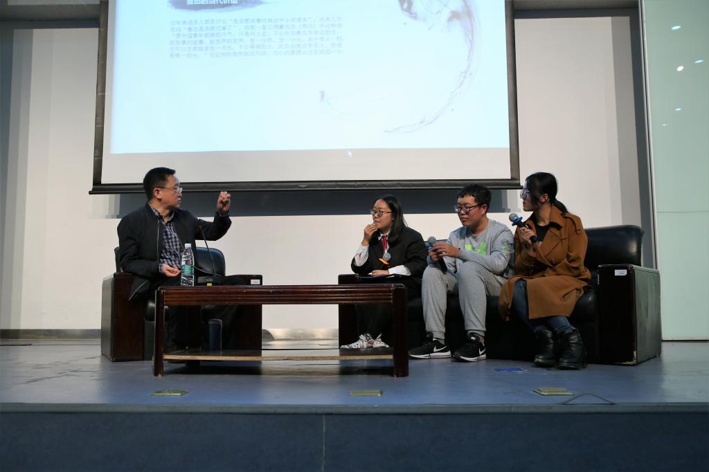 随后的座谈环节,阎老师分别与三位同学分享了鲁迅对当代大学生的启发,语文教材中的鲁迅等话题。阎老师也对当代大学生作出寄语:大学生最好读懂一两个人,不一定要是鲁迅,可以是文学,哲学或其他某一领域的大家。