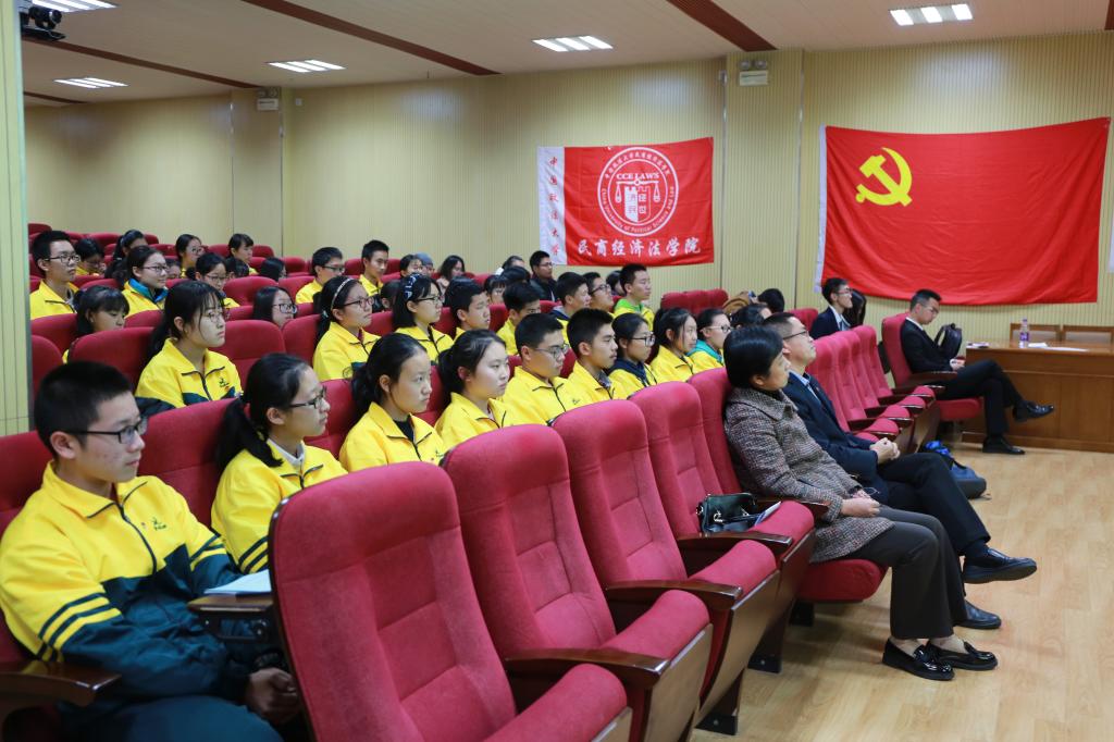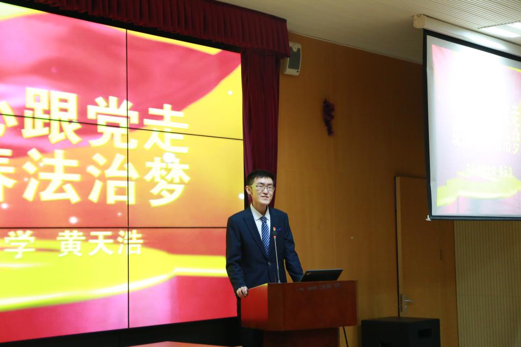 首先,黄天浩以“不忘初心跟党走,绽放青春法治梦”为主题,与在座的学生介绍了他在大学期间的社团经历,并讲述了自己即将开始的西部支教计划。“要到祖国最需要的地方去”是黄天浩一直牢记的信念。礼堂中传来他掷地有声的宣誓:“为中国的社会主义建设和人类文明进步奋斗终身”,同学们都为他话语中的情怀感动,现场掌声不断。