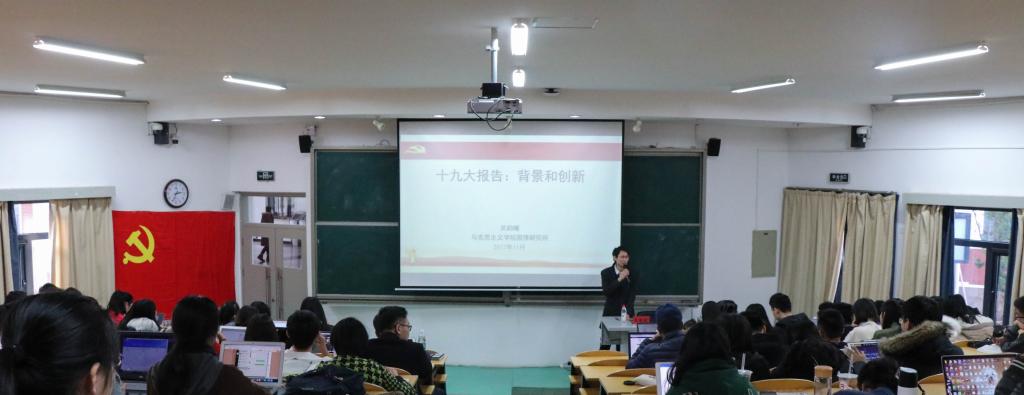 分团委在第五阶梯教室举行团员青年学习贯彻党的十九大精神专题报告会。我校学习贯彻党的十九大精神宣讲团成员、马克思主义学院吴韵曦老师应邀作题为《党的十九大报告:背景与创新》的专题报告。学院学生组织骨干、各年级团总支、各班级班团委参加报告会。