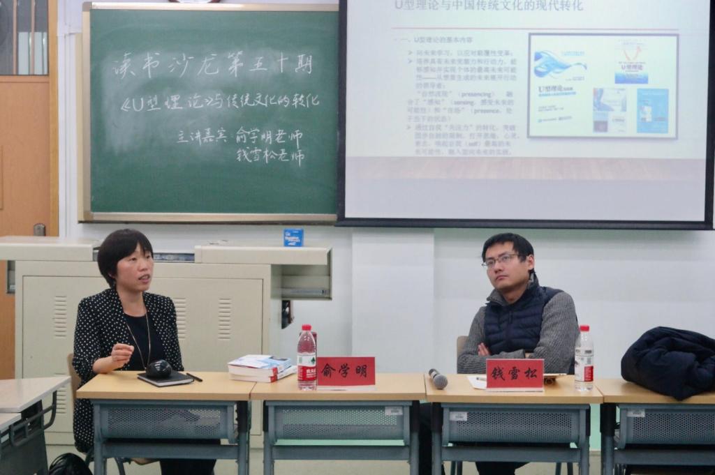 人文学院俞学明、钱雪松教授担任嘉宾。两位老师与同学进行了有关《U型理论》与传统文化的转化的分享,带领同学们思考在传统文化的现代转化中如何借用“U型理论”,为传统注入新鲜的血液。以下是本期读书沙龙的回顾。