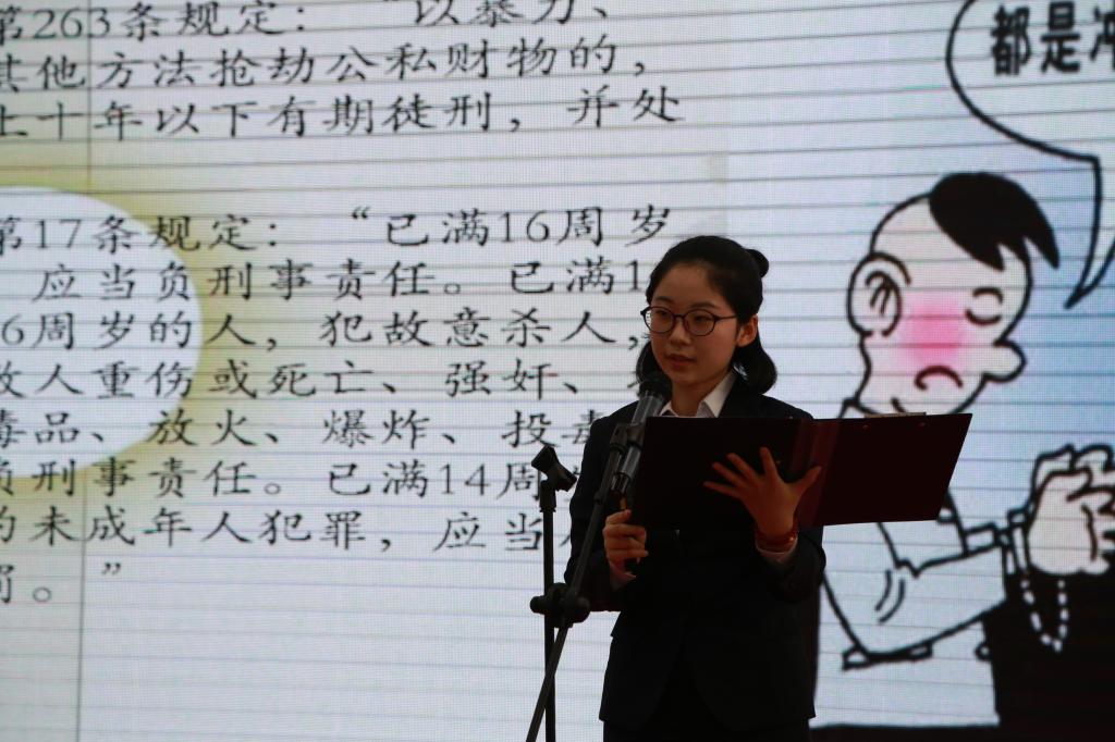接着,徐飞以“知法懂法,远离犯罪”为题向同学们介绍了未成年人犯罪问题。她将未成年人犯罪分成四种类型,并加上相应的案例分析,让晦涩难懂的法律知识一下子变得有趣易懂。徐飞向同学们介绍了《未成年人保护法》,她幽默风趣的语言风格和实用的讲说吸引了同学们的注意力。徐飞的讲说一来指出未成年人在法律上受到保护,教导同学们应当学会用法律的武器保护自己;二来强调该法的存在意义并不意味着未成年人可以“无法无天”,并用案例告诉同学们未成年人也要知法守法。在座的同学聆听地十分认真,结束之后掌声雷动。