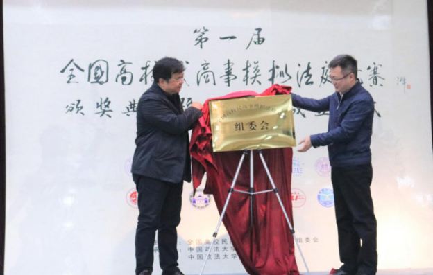 随后,刚文哲教授、王洪松教授一同为全国高校民商事模拟法庭竞赛组委会揭牌,正式宣布组委会成立。