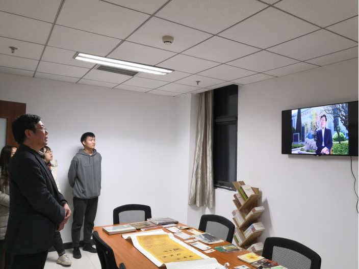 之后,焦玉星一行来到位于逸夫楼的焦裕禄精神学习室,和正在此进行学习的同学一起交流,对学习室的建设给予指导。