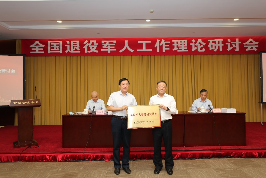 会上,退役军人事务部党组书记、部长孙绍骋向我校授予了“退役军人事务研究基地”牌匾。冯世勇副校长代表我校接受了牌匾。