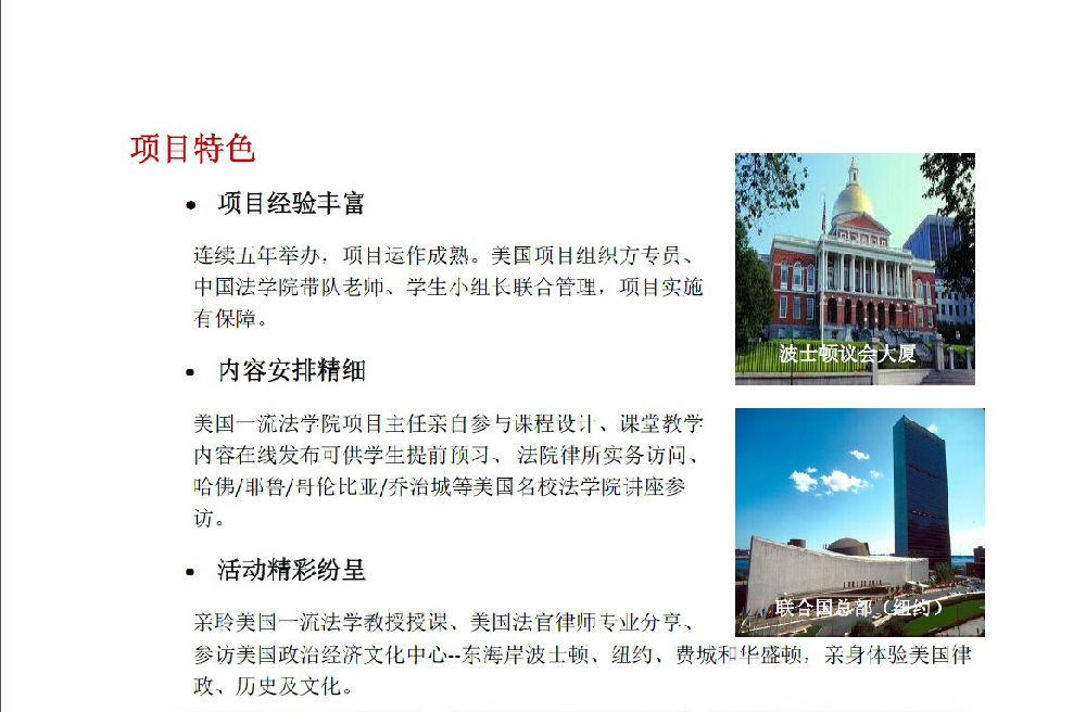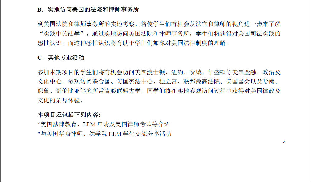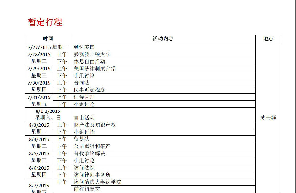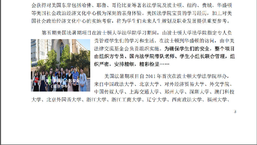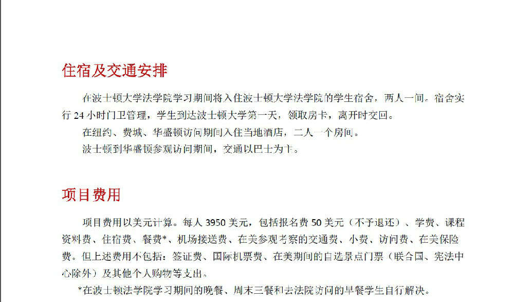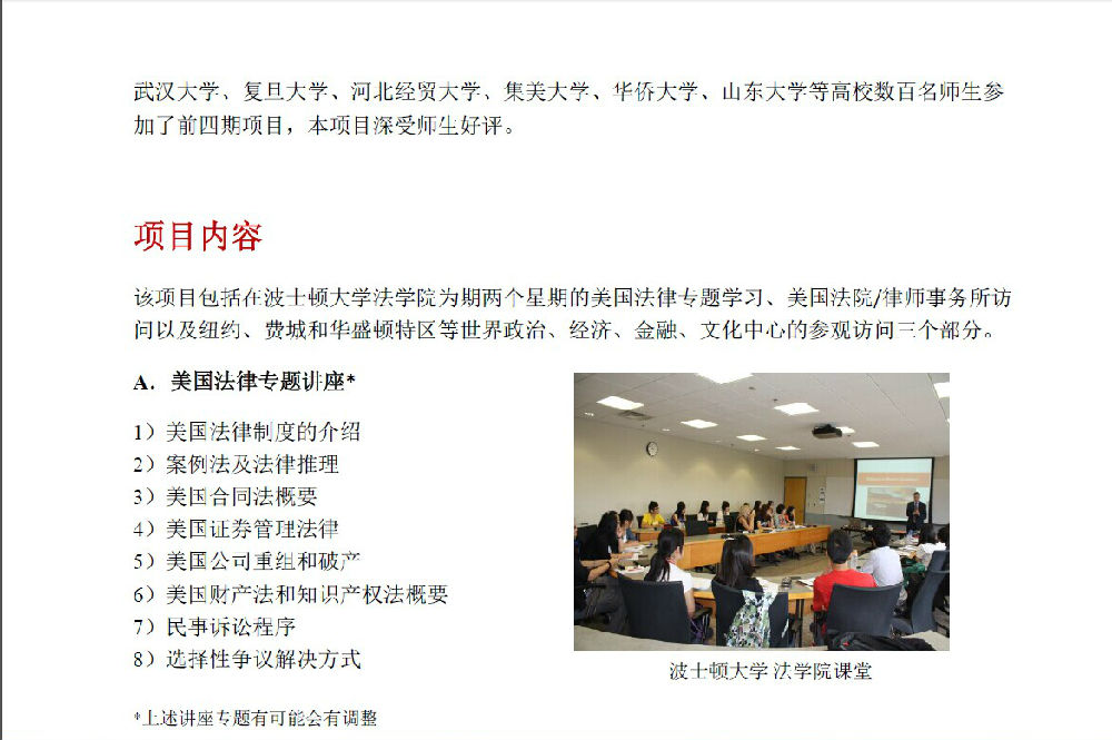 第五期美国法暑期项目通知——波士顿大学法学院 作者: 发布时间:2015年03月23日 00:00 阅读数: 申请程序: 中国法学院在读本科生及研究生均可申请参加本项目。 有意参加本项目的,请按照下列说明,提交材料,完成申请程序: 1、填写申请表(见下文),将填好的申请表、中英文个人简历及近期免冠正面照片(JPEG 文件) 发送邮件到[email protected]。咨询电话:58909324(孙老师) 2、 报名时间:2015年3月15日——4月15日。提醒:赴美需要办理护照、签证及购买机票等相关事宜;暑期属于赴美旺季,机票十分紧张。有意参加该项目的学生请尽早报名。 分享到: