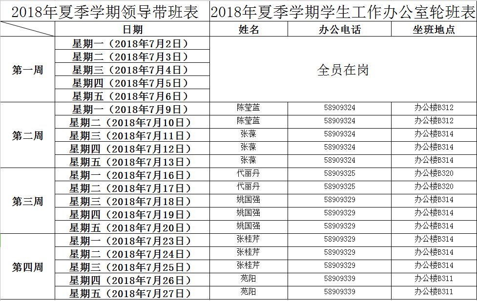 黑料网 2018年夏季学期领导带班、行政人员、辅导员值班安排 作者: 发布时间:2018年06月28日 10:57 阅读数: 2018年夏季学期领导带班表 2018年夏季学期行政人员轮班表 日期 姓名 学院办公室 教学科研办公室 对外培训办公室 研究生工作办公室 学院二级会计 姓名 坐班地点 办公电话 姓名 坐班地点 办公电话 姓名 坐班地点 办公电话 姓名 坐班地点 办公电话 姓名 坐班地点 办公电话 第一周 星期一(2018年7月2日) 全员在岗 全员在岗 全员在岗 全员在岗 全员在岗 全员在岗 星期二(2018年7月3日) 星期三(2018年7月4日) 星期四(2018年7月5日) 星期五(2018年7月6日) 第二周 星期一(2018年7月9日) 卢跃 于丽 昌平主楼B319 58909328 杜智雯 昌平主楼B317 58909198 吴凡 学院路科研楼A1001 58902905 张又 学院路科研楼B508 58908189 星期二(2018年7月10日) 卢跃 于丽 昌平主楼B319 58909328 杜智雯 昌平主楼B317 58909198 吴凡 学院路科研楼A1001 58902905 张又 学院路科研楼B508 58908189 星期三(2018年7月11日) 卢跃 李航 昌平主楼B319 58909328 杜智雯 昌平主楼B317 58909198 吴凡 学院路科研楼A1001 58902905 张又 学院路科研楼B508 58908189 刘守革 学院路科研楼B509 58908191 星期四(2018年7月12日) 李永军 李航 昌平主楼B319 58909328 文晋渝 昌平主楼B317 58909334 吴凡 学院路科研楼A1001 58902905 张又 学院路科研楼B508 58908189 吕彦宏 昌平主楼B317 58909687 星期五(2018年7月13日) 李永军 李航 昌平主楼B319 58909328 文晋渝 昌平主楼B317 58909334 吴凡 学院路科研楼A1001 58902905 张又 学院路科研楼B508 58908189 第三周 星期一(2018年7月16日) 于飞 李航 昌平主楼B319 58909328 文晋渝 昌平主楼B317 58909334 刘平 学院路法苑楼304 58908366 徐兢冉 学院路科研楼B508 58908189 星期二(2018年7月17日) 于飞 李航 昌平主楼B319 58909328 闫俊波 昌平主楼B317 58909334 刘平 学院路法苑楼304 58908366 徐兢冉 学院路科研楼B508 58908189 星期三(2018年7月18日) 于飞 李航 昌平主楼B319 58909328 闫俊波 昌平主楼B317 58909334 刘平 学院路法苑楼304 58908366 徐兢冉 学院路科研楼B508 58908189 刘守革 学院路科研楼B509 58908191 星期四(2018年7月19日) 赵旭东 李航 昌平主楼B319 58909328 闫俊波 昌平主楼B317 58909334 刘平 学院路法苑楼304 58908366 徐兢冉 学院路科研楼B508 58908189 吕彦宏 昌平主楼B317 58909687 星期五(2018年7月20日) 赵旭东 李航 昌平主楼B319 58909328 杜涤炘 昌平主楼B317 58909334 刘平 学院路法苑楼304 58908366 黄晓春 学院路科研楼B508 58908189 第四周 星期一(2018年7月23日) 王洪松 郝宏倩 昌平主楼B319 58909327 杜涤炘 昌平主楼B317 58909334 王博 学院路法苑楼303 58908187 黄晓春 学院路科研楼B508 58908189 星期二(2018年7月24日) 王洪松 郝宏倩 昌平主楼B319 58909327 杜涤炘 昌平主楼B317 58909334 王博 学院路法苑楼303 58908187 黄晓春 学院路科研楼B508 58908189 星期三(2018年7月25日) 王洪松 郝宏倩 昌平主楼B319 58909327 甄贞 昌平主楼B317 58909334 王博 学院路法苑楼303 58908187 李嵩 学院路科研楼B508 58908189 刘守革 学院路科研楼B509 58908191 星期四(2018年7月26日) 杨秀清 郝宏倩 昌平主楼B319 58909327 甄贞 昌平主楼B317 58909334 王博 学院路法苑楼303 58908187 李嵩 学院路科研楼B508 58908189 吕彦宏 昌平主楼B317 58909687 星期五(2018年7月27日) 杨秀清 郝宏倩 昌平主楼B319 58909327 甄贞 昌平主楼B317 58909334 王博 学院路法苑楼303 58908187 李嵩 学院路科研楼B508 58908189 分享到: