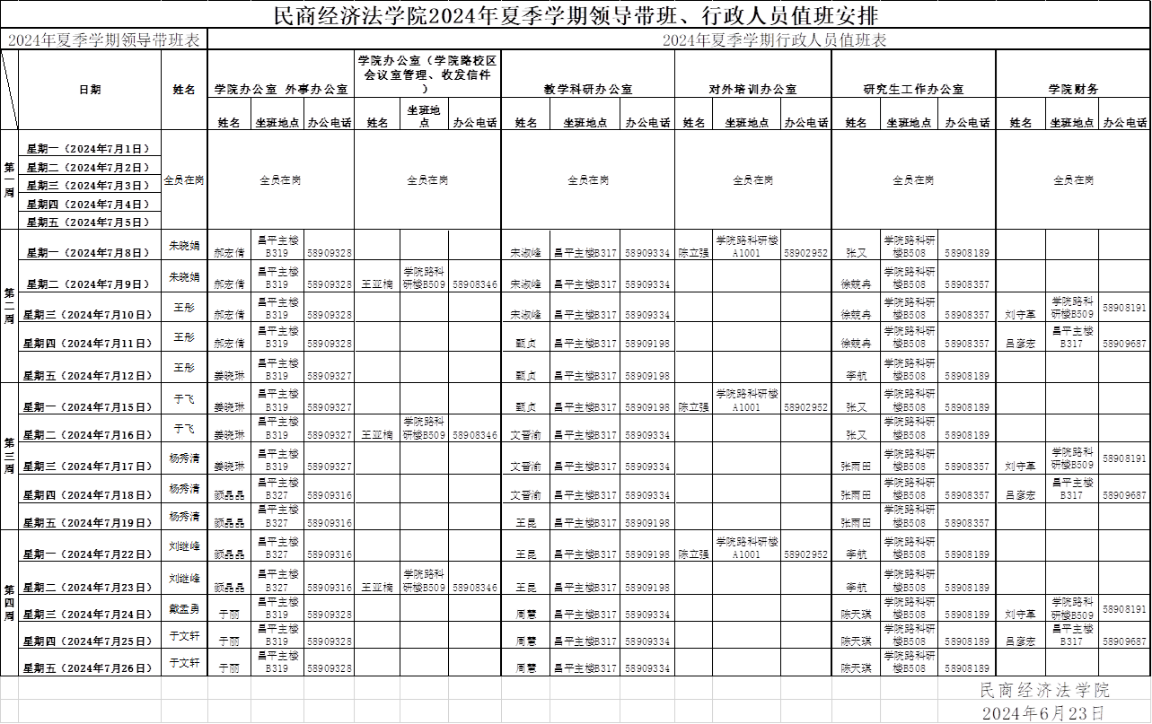 黑料网 2024年夏季学期领导带班、行政人员值班安排