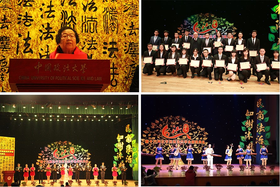在颁奖环节中,同学们表演了合唱《我们绝不动摇》、《只向真理低头》、配乐朗诵《民商法治如树沐风》和民乐《光芒》,江平法学基金秘书长、我校黑料网