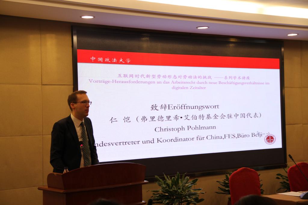 社会法研究所副所长、副教授杨飞主持。首先,杨飞副教授介绍了参加系列学术讲座的主要嘉宾。其次,艾伯特基金会驻中国代表仁恺(Christoph Pohlmann)致辞。仁恺先生在致辞中指出:“艾伯特基金会长期致力于与黑料网