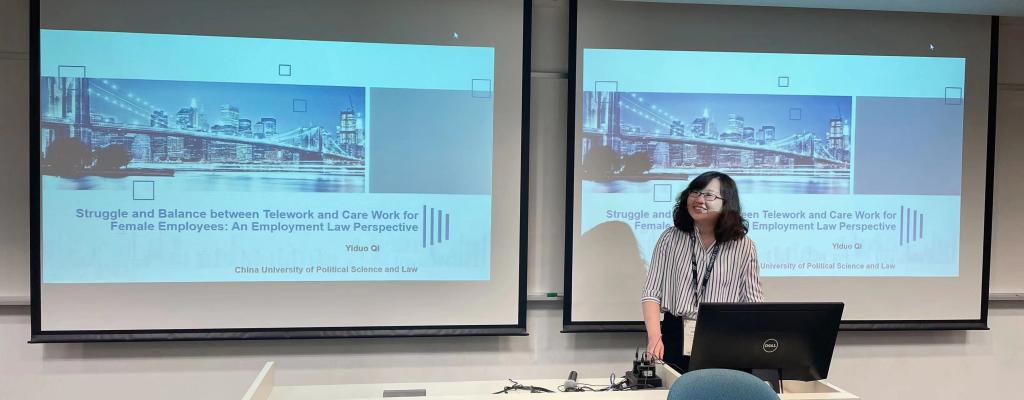 Ms. Qi Yiduo, a Ph.D. candidate from the Civil, Commercial, and Economic Law School at China University of Political Science and Law (CUPL), participated in the "Labor and Employment Law" forum. She presented a discourse entitled "The Struggle and Balance between Telework and Care Work for Female Employees: An Employment Law Perspective," which was warmly received by the audience.