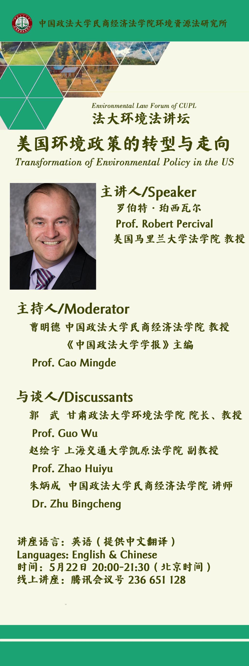 Lecture on "Transformation of Environmental Policy in the US" by Professor Robert Percival, University of Maryland