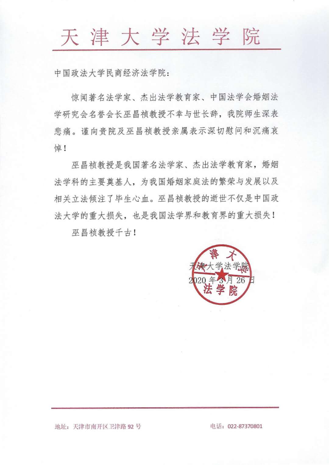 天津大学法学院唁电