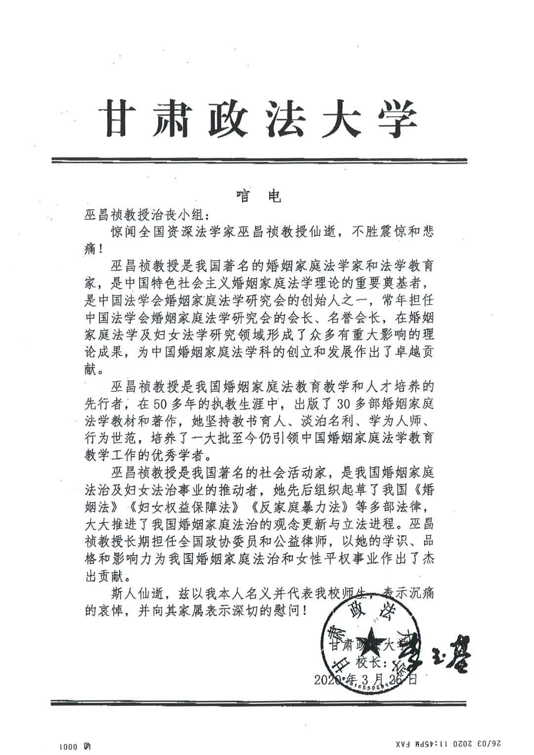 甘肃政法大学唁电