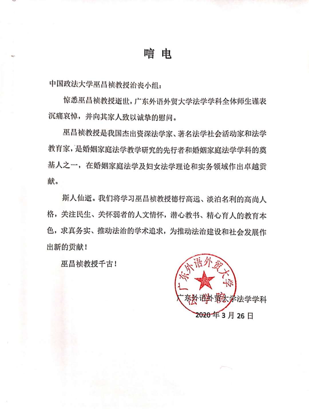广东外语外贸大学法学院唁电