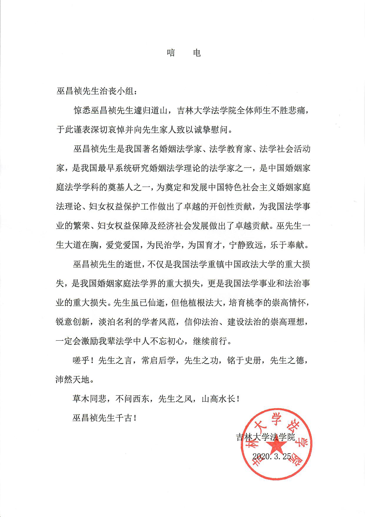 吉林大学法学院唁电
