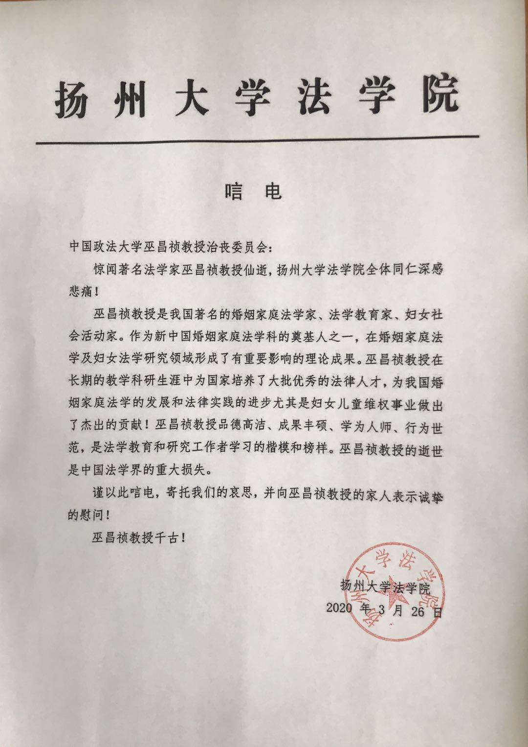 扬州大学法学院唁电