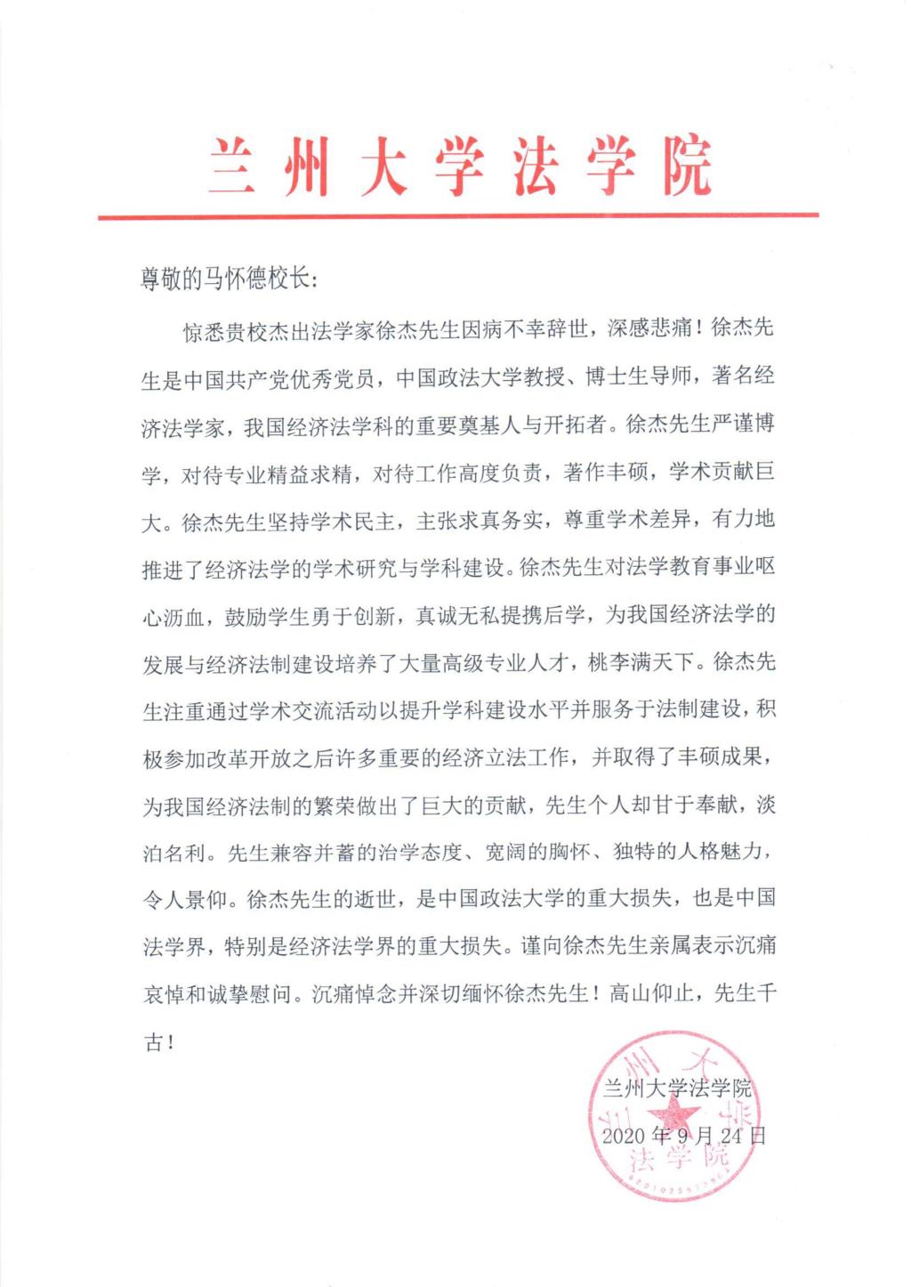 兰州大学法学院唁电