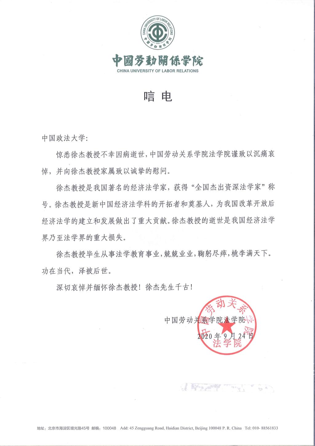 中国劳动关系学院法学院唁电
