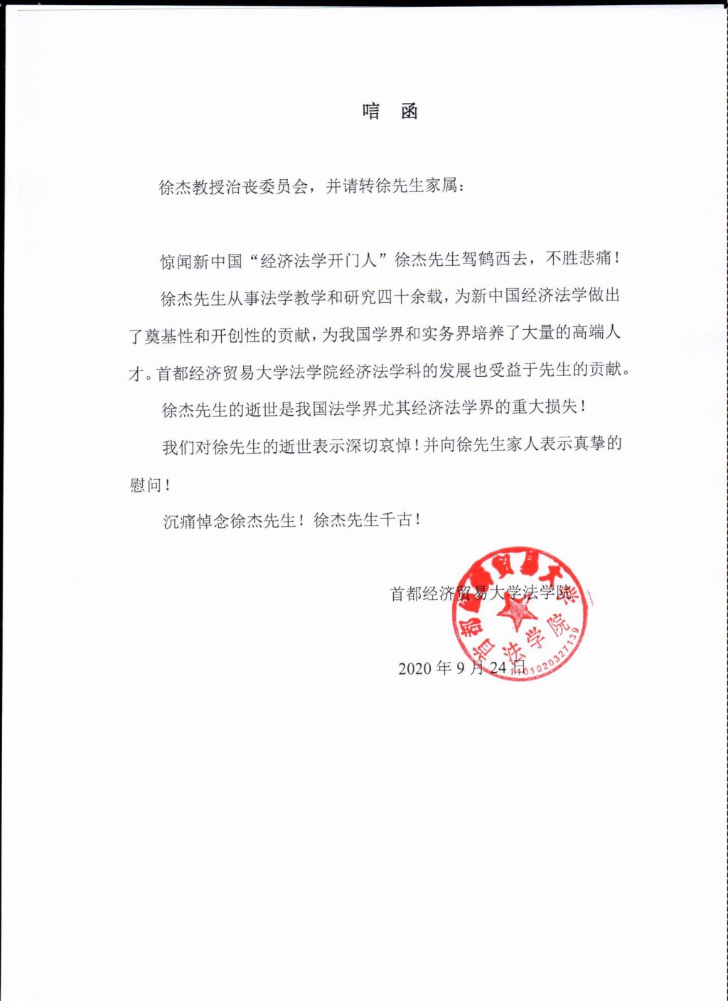 首都经济贸易大学法学院唁电