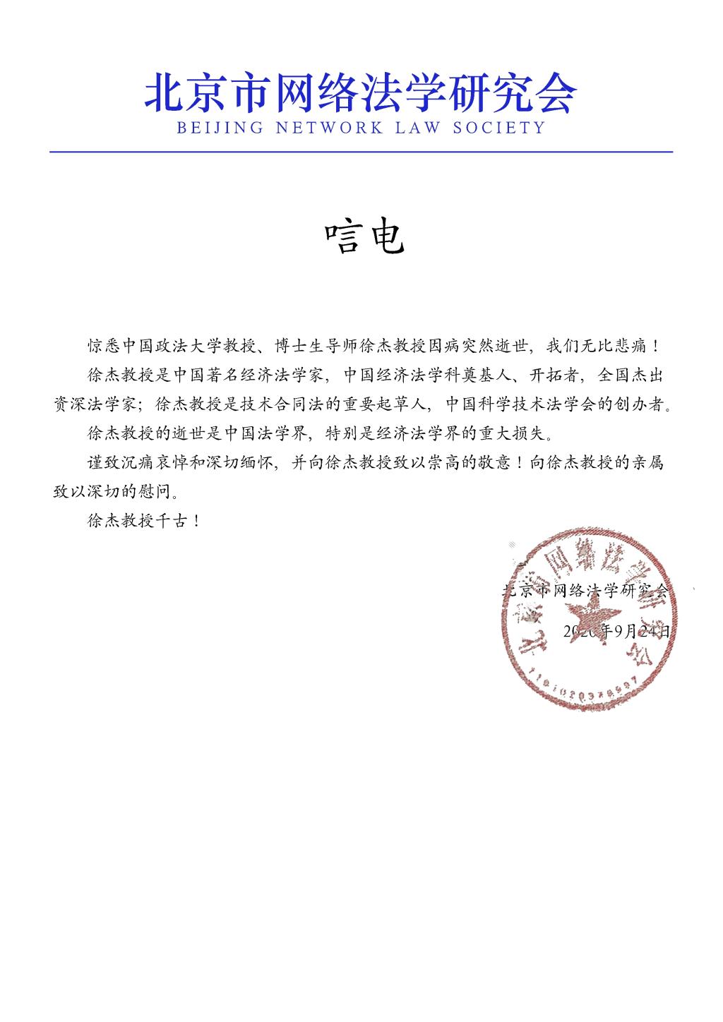 北京市网络法学研究会唁电