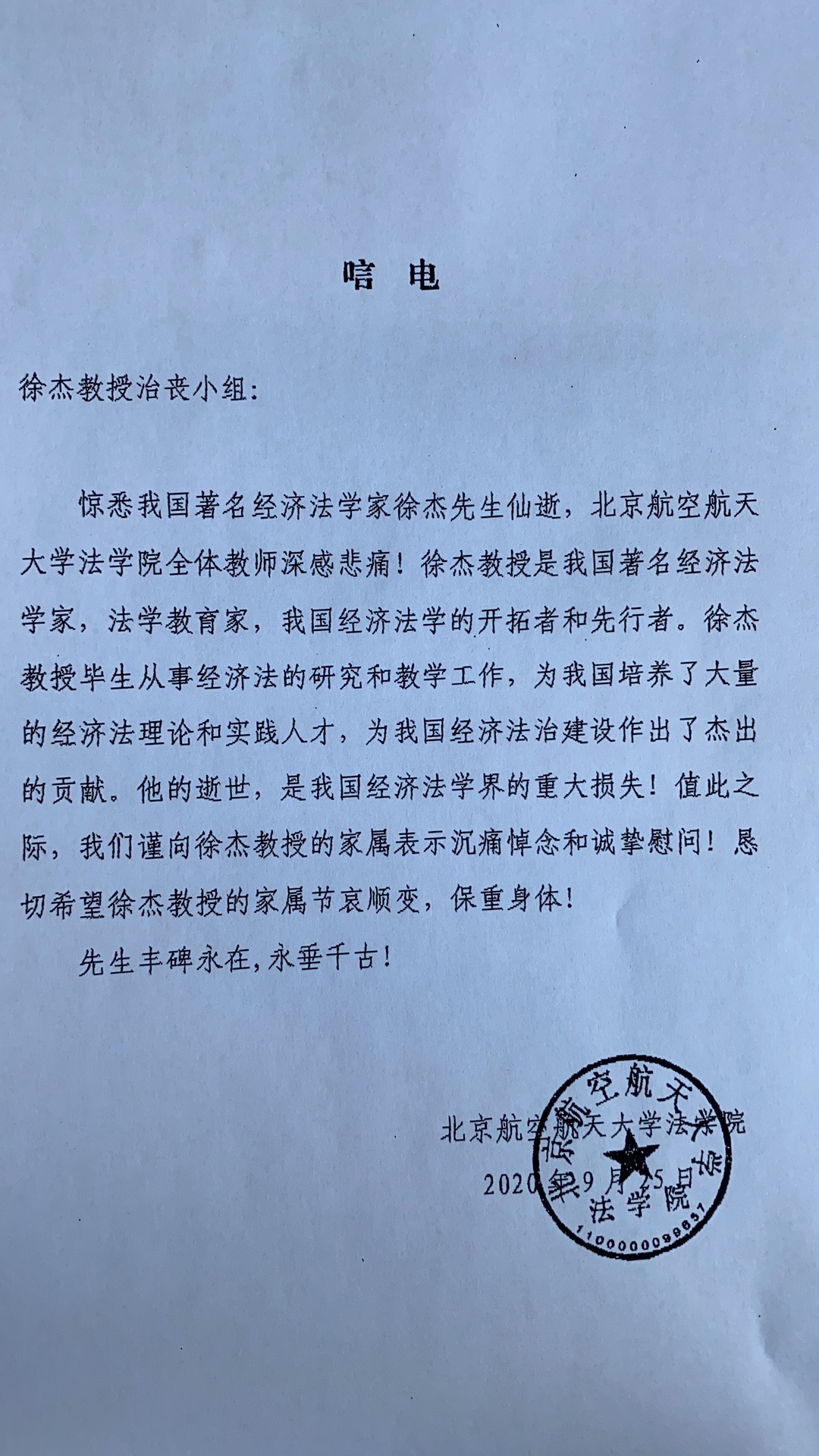 北京航空航天大学法学院唁电
